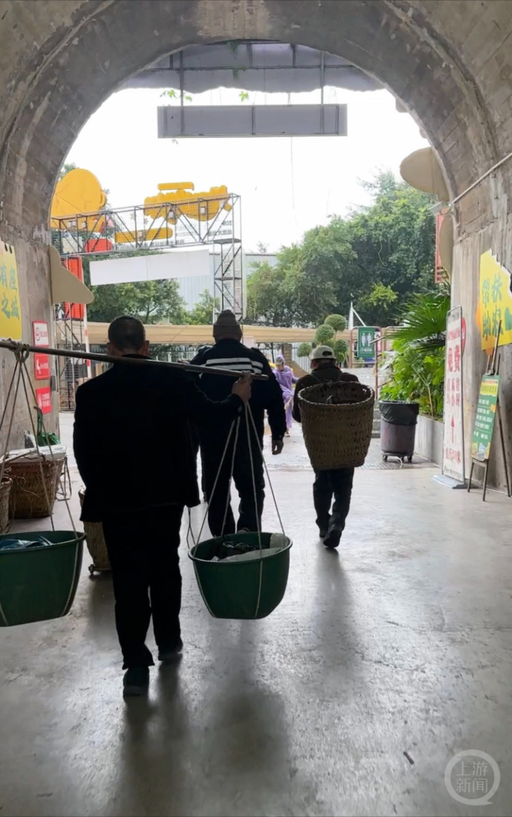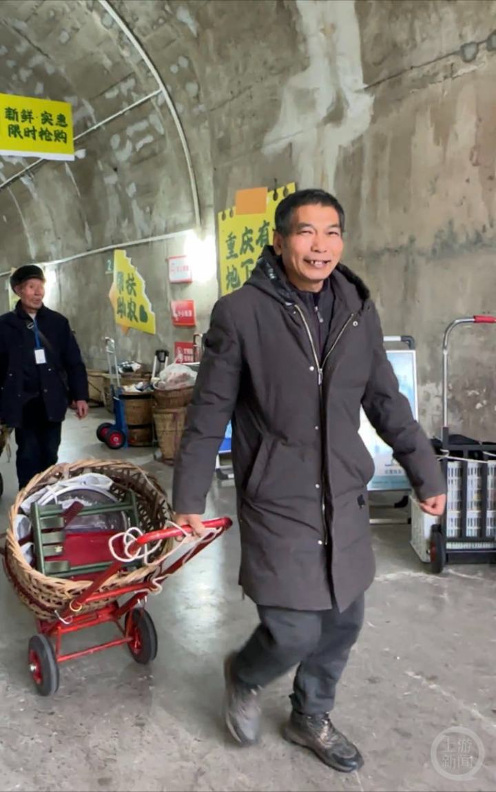 周六上午11点,72岁的石船镇居民陈叔叔卖完了担来的最后一把菜,“今天下雨,但生意还不错,卖了180元,是个吉利的数字!”他笑得合不拢嘴。“龙年完美收市!这一年很辛苦,但也很满足。”他说,每周都要背着背篓坐轨道“打卡”,来这个防空洞“打卡”,背篓见证了一年的辛劳付出和满满的回报,准备用挣的钱给孙子买辆“高级”玩具汽车当春节礼物。