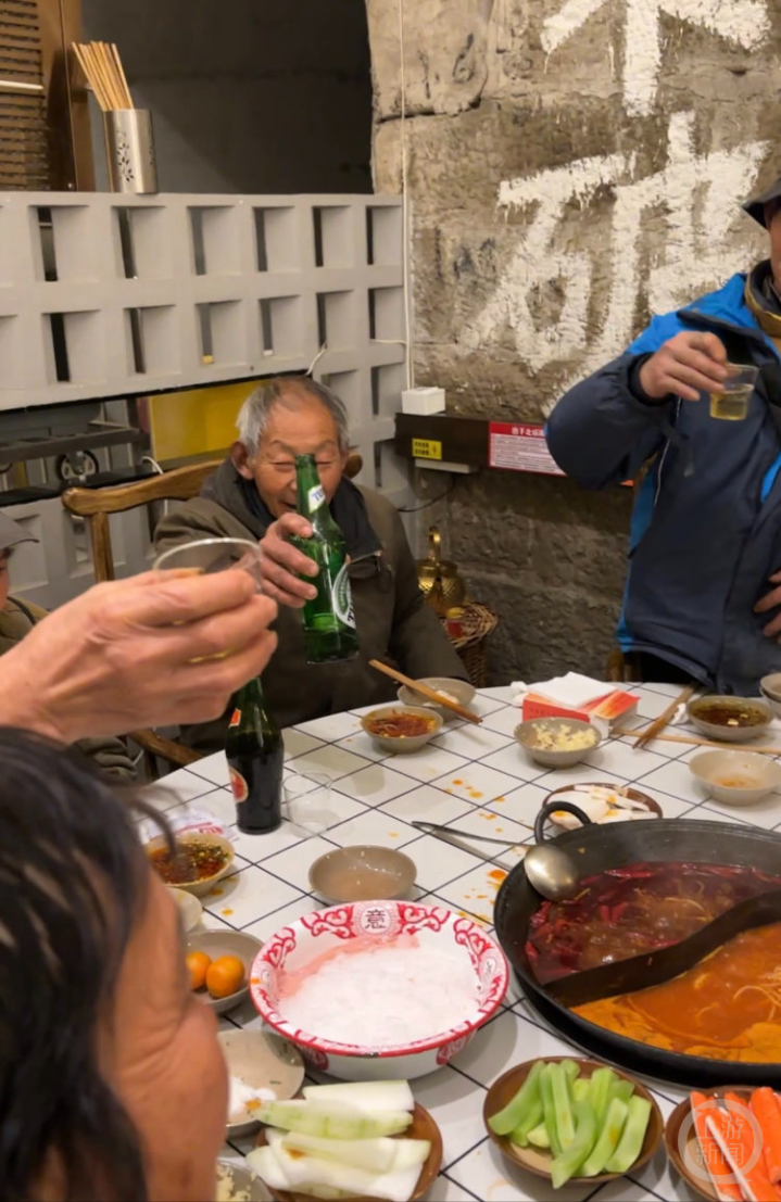 “老辈子,卖完菜先不要慌着走哈,请大家吃顿火锅,祝愿来年红红火火!”让菜农们惊喜的是,隔壁火锅店老板早已摆好了酒菜,邀请他们过去吃团年饭。