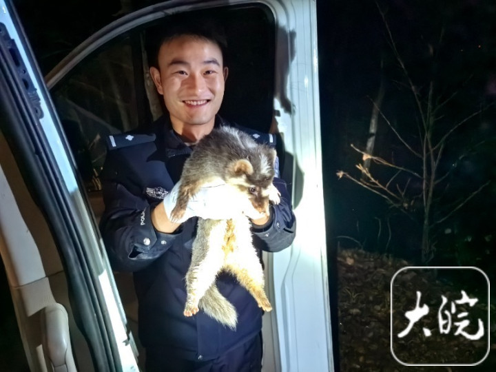 经辨认,这个“小家伙”是国家二级保护动物果子狸。民警小心翼翼地靠近果子狸,蹲下身子,轻轻地安抚着,随后将果子狸包裹起来,小心翼翼地抱上了警车。